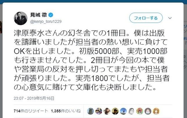 編集担当者がどれだけの情熱で会社を説得し、出版に漕ぎ着けているかということをわかっていただきたく実売部数をツイートしましたが、本来書くべきことではなかったと反省しています。