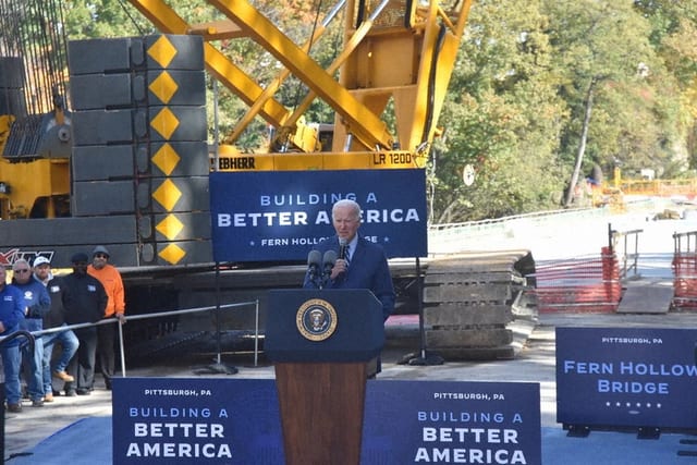 再建中の橋のたもとでインフラ整備の重要性について演説するバイデン米大統領=米東部ペンシルベニア州ピッツバーグで10月20日