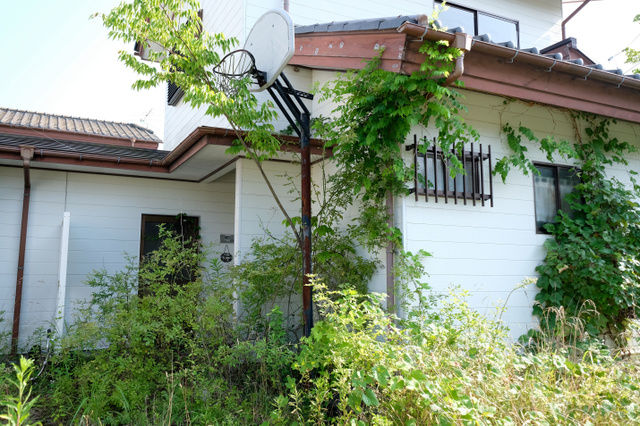 町営住宅には2階部分まで雑草が生えていた=7月20日、福島県双葉町