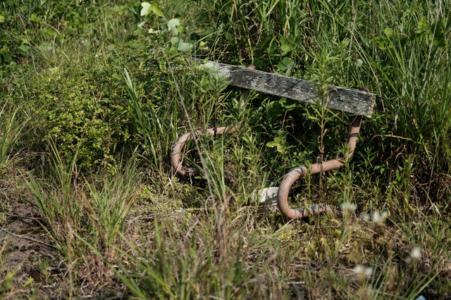雑草に埋もれる車=7月20日、福島県双葉町
