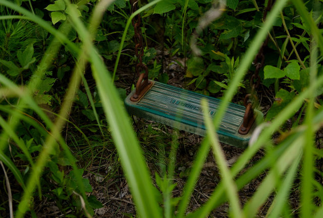 雑草に埋まる「くままち児童館」のブランコ=7月27日、福島県大熊町