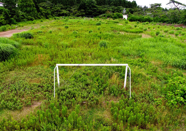 雑草が生い茂る大熊町立熊町小の校庭=7月27日、福島県大熊町
