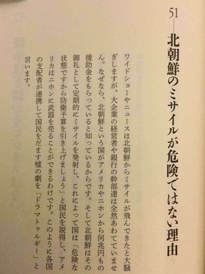 いや、まあ、ああいう国を愛する必要は無いと思うが、北朝鮮のミサイルなど安倍総理との連携プレー、政治的プロレスだというのは(最近、東大の教授か何かがそういう発言をして話題になったようだが)ネットの政治ブログを見ている人の半数くらいには(信じるかどうかは別として)常識的な知識だろう。まして、ミサイルが発射されたら頭を下げて地に伏せなさいとか何とか、21世紀どころか、第二次世界大戦のころでも、竹槍で飛行機を落とすレベルの笑い話だろう。
