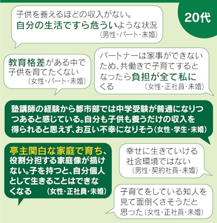 冒頭は20代男性(正社員・既婚)の回答で、「人口という確実な数値を踏まえ、これから衰退期に入る日本に生まれるのは子供がかわいそう。責任を負いきれない」と続いた。「社会に望むことは」という別の質問には「政府や社会は変わらない」とだけ記してあった。