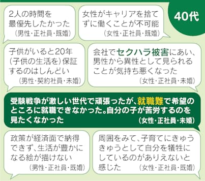 日本経済新聞社が1月、「生涯子供なし、日本突出 50歳女性の27%」と報じたところ、SNS(交流サイト)などで大きな反響があった。子供を産めなかった理由など多数のツイートが「#生涯子供なし」付きで流れた。より具体的な声を聞こうと2月に読者アンケートを実施。延べ5000を超える自由回答から浮かび上がったのは、日本で子供を産み育てることへの不安や諦め、子供を持たない人が背負わされる負担だった。