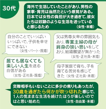 「亭主関白な家庭で育ち、役割分担をして生活する家庭像が思い描けない」(20代女性・正社員・未婚)、「両親が不仲だった」(20代男性・正社員・未婚)などだ。