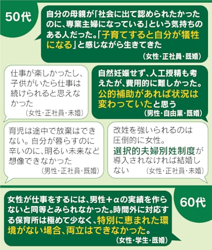 「自分の母親が『社会に出て認められたかったのに、専業主婦になっている』という気持ちのある人だった。『子育てすると自分が犠牲になる』と感じながら生きてきた 」(50代女性・正社員・既婚)などだ。