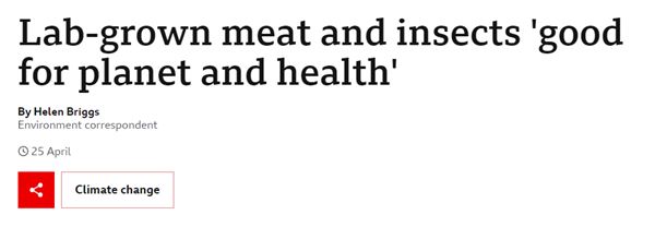 上の見出しについて、いくつか注意すべき点がある。第一に、合成「肉」の推進は、全く同じアジェンダの一部である。第二に、この記事は「環境特派員」によって書かれ、トピックとして「気候変動」の下にファイルされている。これは、昆虫と合成食品に基づいた食生活を採用するよう世界に強要し、恥をかかせるために取られた切り口である。