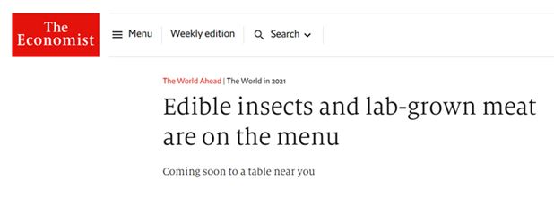 エリート御用達のThe Economistが全く同じ食生活を推進する記事。昆虫と実験室で作られた肉である