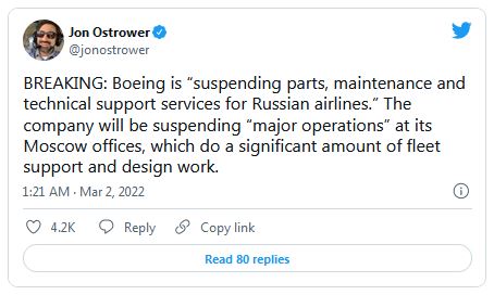 この動きを分かりやすく説明するもう一つの方法があります。民間航空機メーカーのボーイング社は、ロシアの航空会社が所有するボーイング機へのサポートとスペアパーツの提供をすべて中止すると発表したばかりです。